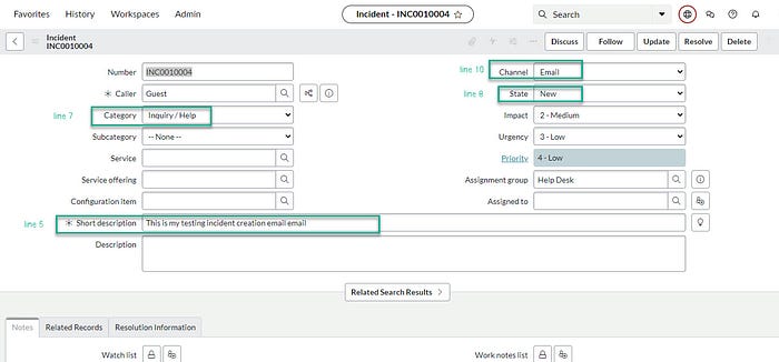 If you read the code in blue, line 5 — it’s saying ‘grab the email subject and put it in the short description box on the incident’ and it did that.