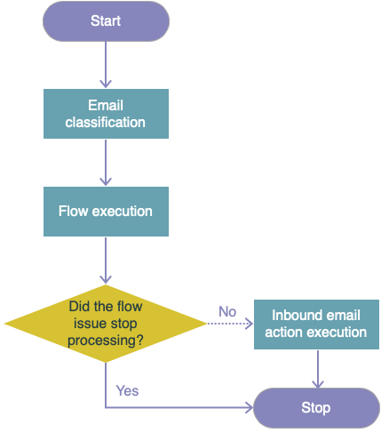 The high level processing of inbound emails is as follows — NOTE the ‘flow’ comes BEFORE the ‘action’ on the bottom right: