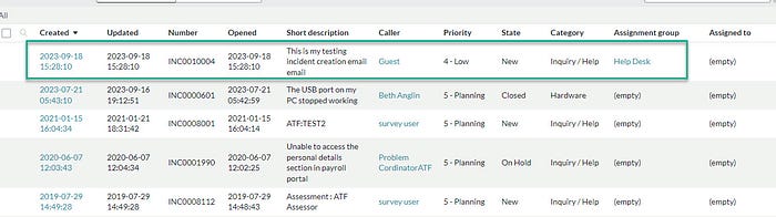 8. Navigate to the incident list > all and sort by ‘created’ — look for the email subject that you just sent and open the form