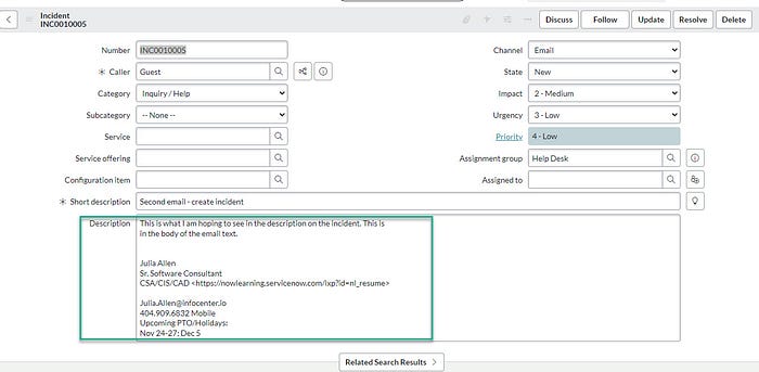 - Test by sending a email to the support email. Note the ABOVE incident has no description text but BELOW it now does