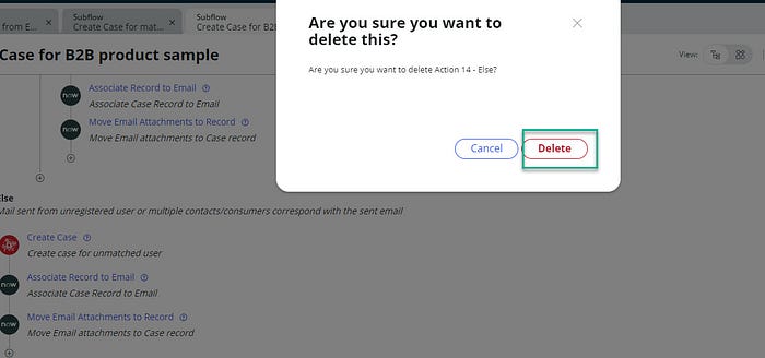 9. You want to modify and only use actions that are relevant to your sub-flow. For example, there won’t be any unregistered users — so hover over the ‘else — mail sent from unregistered user or multiple contracts/consumers correspond with the sent email’ and press the ‘trash can’ on the right side and then press ‘delete’ on the window