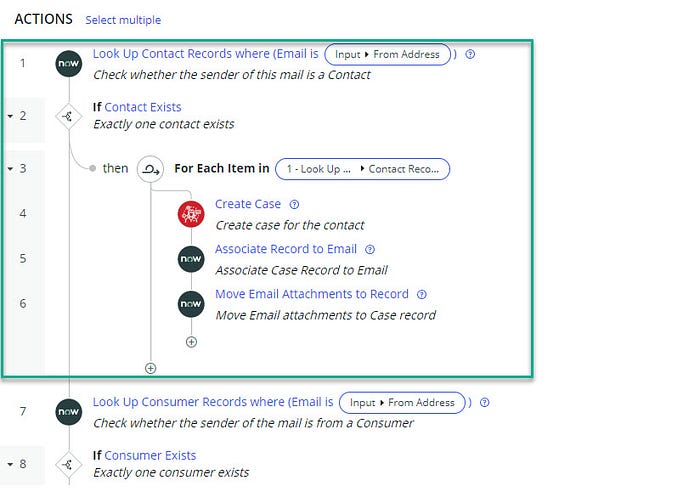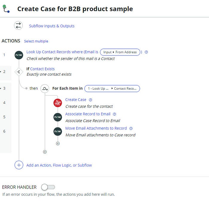 However each option works. I recommend moving as much as possible towards inbound email flows. Not just because ServiceNow says so, but because inbound flows are actually a lot easier to use and troubleshoot (so it can save even the developers time). Visually they are intended for low-code users, and more tech savvy business users, to configure and build for their own purposes. It natively has a way to “recycle” repeatable actions (such as the user lookup for and record match for CSM accounts and teams— imagine having to set that code/condition up EACH TIME you needed an inbound setup — yikes!!)