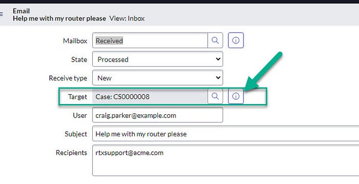 22. Re-open the email and look at the ‘target’ field and make sure it’s filled out. Then click on the ‘i’ icon and go to the case.