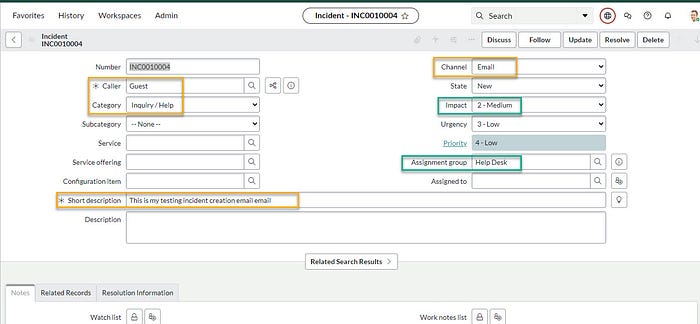 7. Let’s test. I am going to email my support email, and see what happens on the inbound now that I set up my assignment group and impact above.