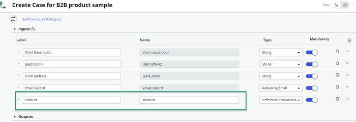 12. Create a new input field at the very top of the sub-flow in the input section. Do this by pressing the (+) on the top right next to mandatory. Since we are using product, type the word product and in ‘type’ choose ‘reference’ and then locate the product model so it shows as reference.product model. Press ‘done’