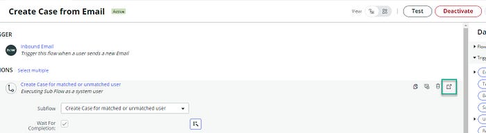 On the main ‘create case from email’ flow, expand the ‘actions > create case for match or unmatched user’ and click on the right side arrow pointing to outside the box. It will open a new window.