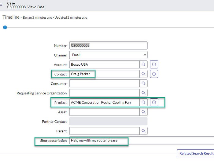 23. On the case form, note that the product auto-populates and the other fields from the variable list on the flow are there. Such as the subject, contact, account and any other ones you added to the updated flow.