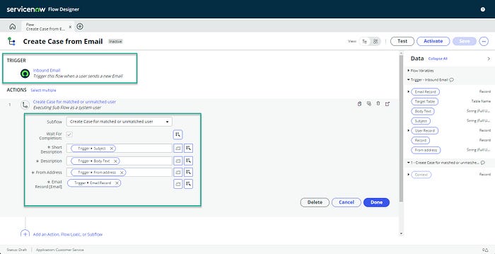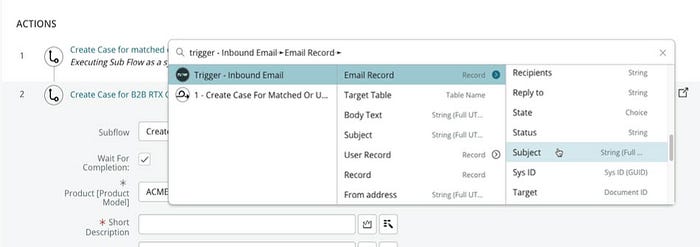 - Short Description — Using the data pill picker, make sure you go to trigger inbound email > email record > subject