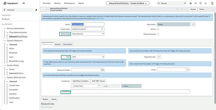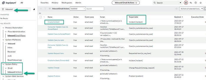 - Actions — similar to business rules, they are the traditional scripted/filtered way to take action on a target table when the conditions are met; these run AFTER flows. Go to System Policy > Inbound Actions to see the entire list.