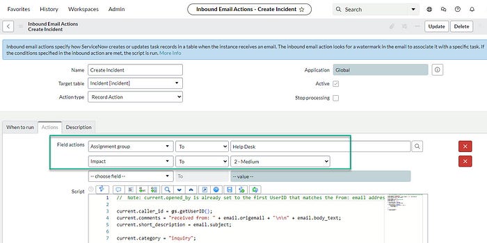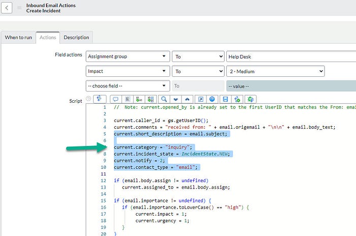 If we return to the inbound action > create incident > ‘actions’ tab and scroll to the code we can examine what it’s doing.