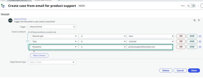 - In the trigger section, expand the ‘Inbound email’ by clicking on it and notice the very similar fields. You see ‘Email conditions’.