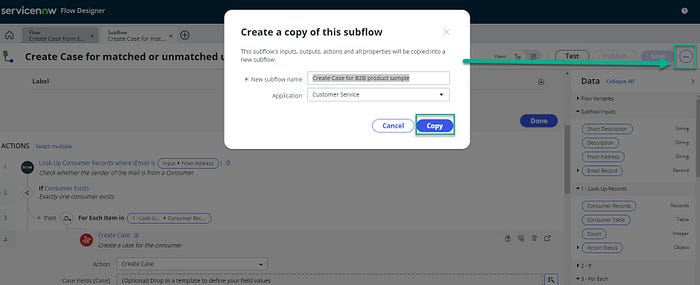 8. In the example, we add the ‘product’ to the sub-flow. So, on the 3 dots on the top right (next to ‘save’) > ‘Copy sub-flow’ and name it anything, ‘Create Case for B2B product sample’ and choose ‘Copy’