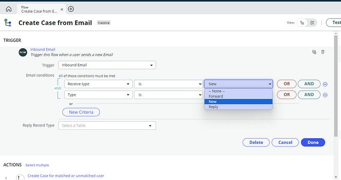 5. Note in the ‘actions’ section, out of the box it uses a sub-flow for ‘create case for matched or unmatched user’. This sub-flow is used by flows, so don’t modify this without cloning it.