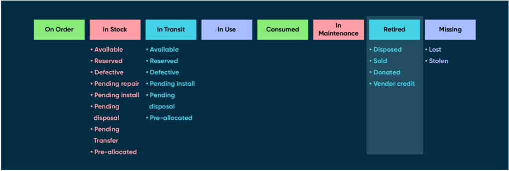 HAM uses an industry standard asset lifecycle, and the key to the disposal state, retired, is in selecting the substate. Why? Because you are tracking what became of the asset. Also, there are normally regulations (external or internal) that control certain types of asset retirement.